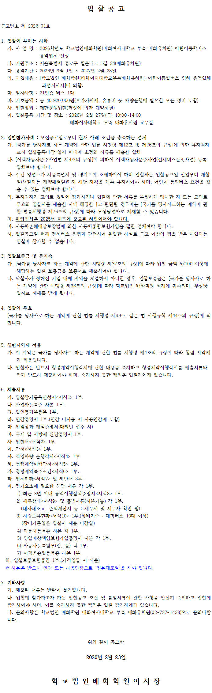 (입찰공고)2026학년도 배화여자대학교 부속 배화유치원 어린이통학버스 용역업체 선정